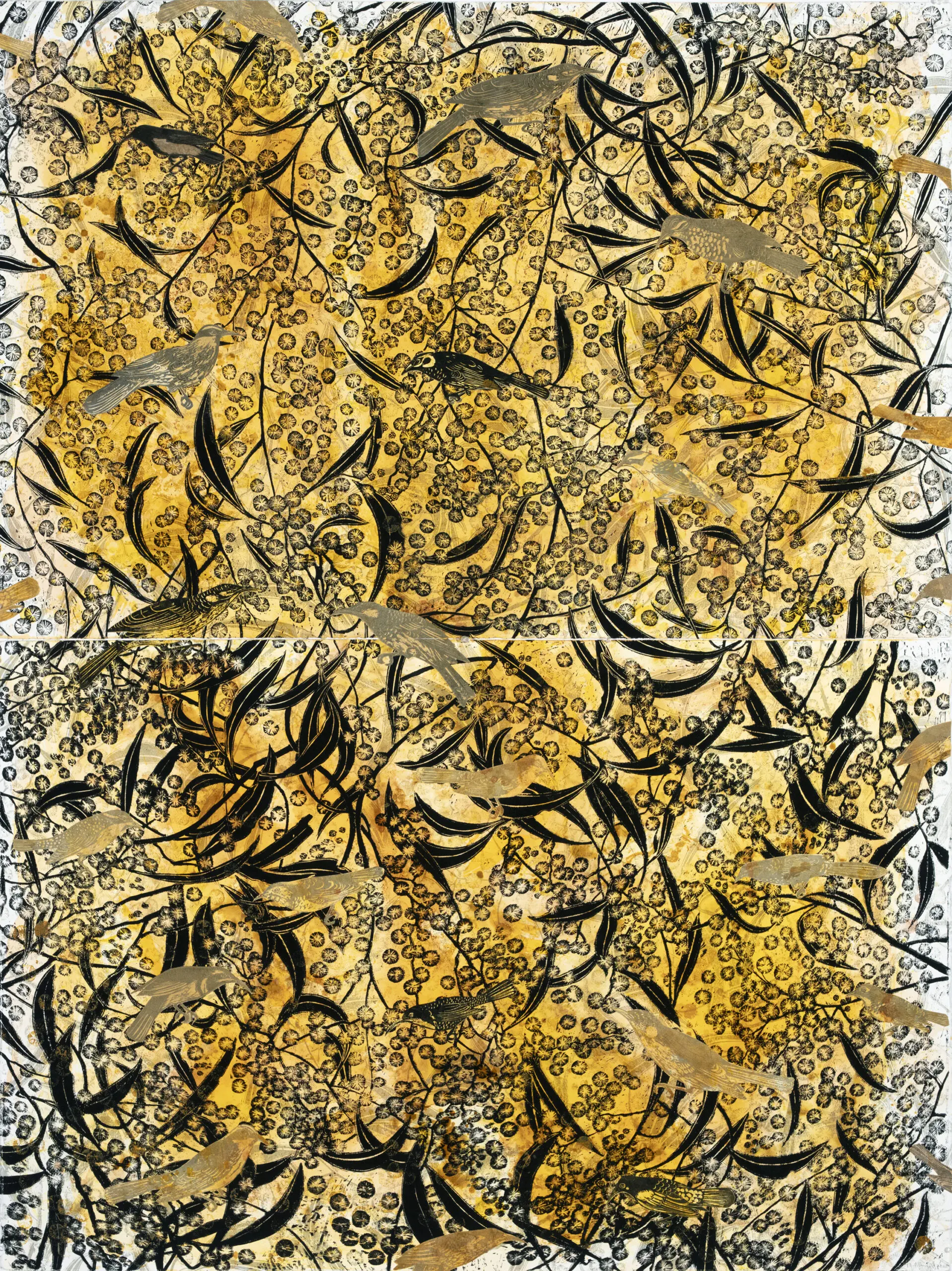 The unique state print has multi layers of Australia’s national flower – the Golden Wattle (Acacia pycnantha) and collage linocut honeyeaters that are printed with fly wire grid and wattle patterns.