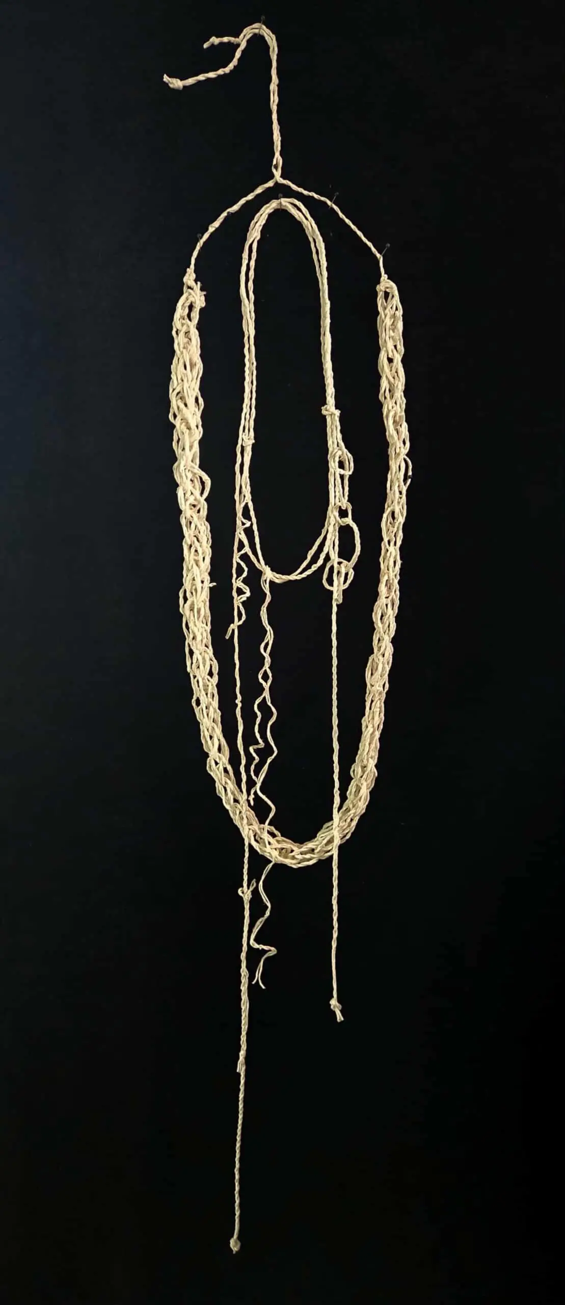 My slow and labour intense attempt to reshaped you into a new skin for me was not to be. My bold arrogance looked to create something big and bold; something that would take a spotlight. I told myself this was about ‘you.’ My intent to tame your own lovely skin to become mine was not to be. In the wetting, twisting, and cording against my own body I learned that the taming was of me, not you. I am in awe of you and what you give; your beauty, breath, and connections with all living things. I was able to make a couple of small skeins. I was grateful; precious, delicate string made from paper, your being. I offer here a simple garland, woven and knotted, curled by my fingers and yours. Thank you for all that you do. I have much to learn.