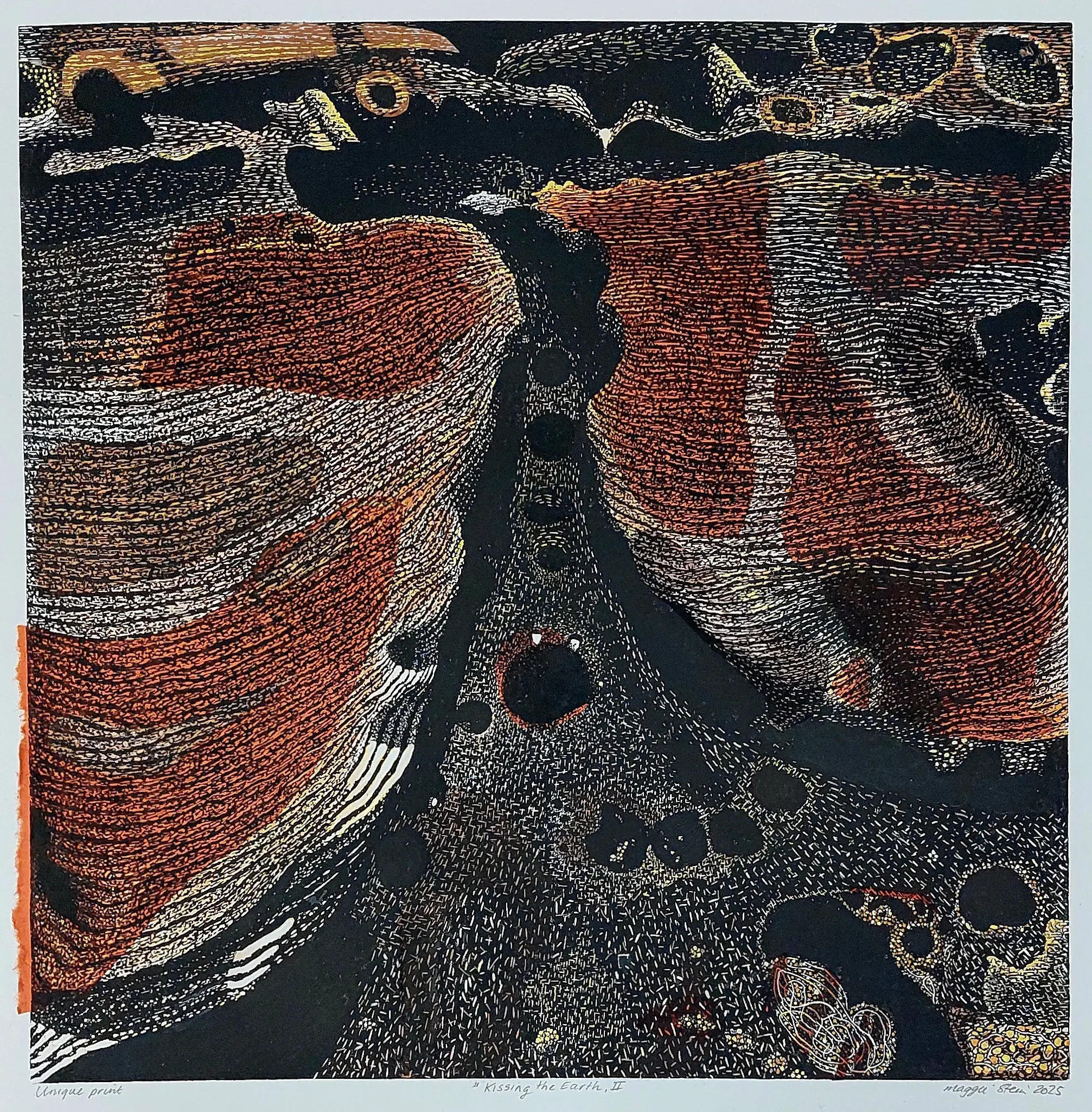 This unique print is a departure from the original black and white image. Using chine colle, I have created another layer, of playful colour.