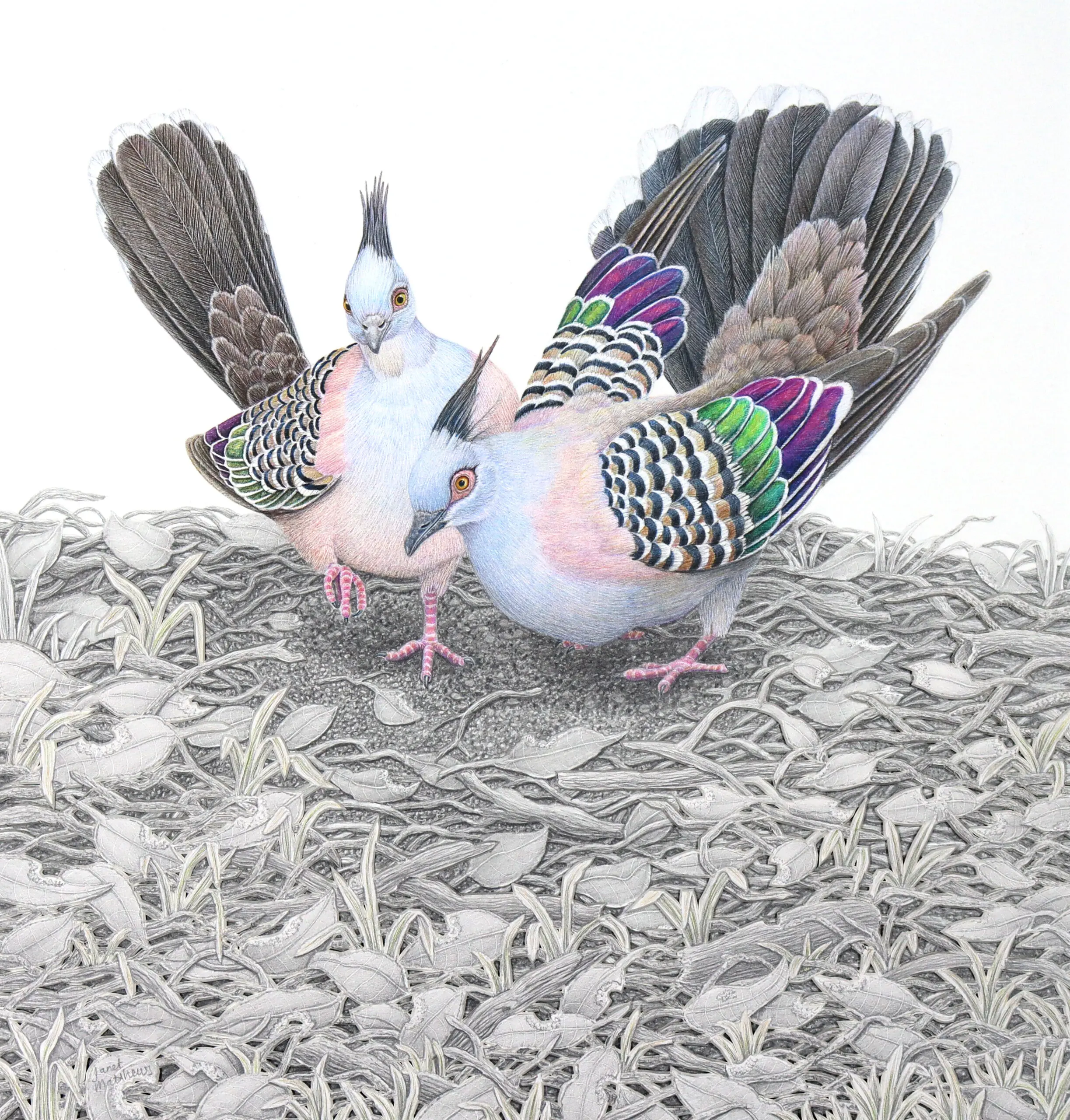 Capturing and sharing the ‘small’ moments in our personal space is my inspiration. I‘ve drawn the pigeons in full colour surrounded by the graphite leaves to create a contrast that focuses the viewer on the birds and their dance. My hand cut layer gives added depth to the ground when you get up close.