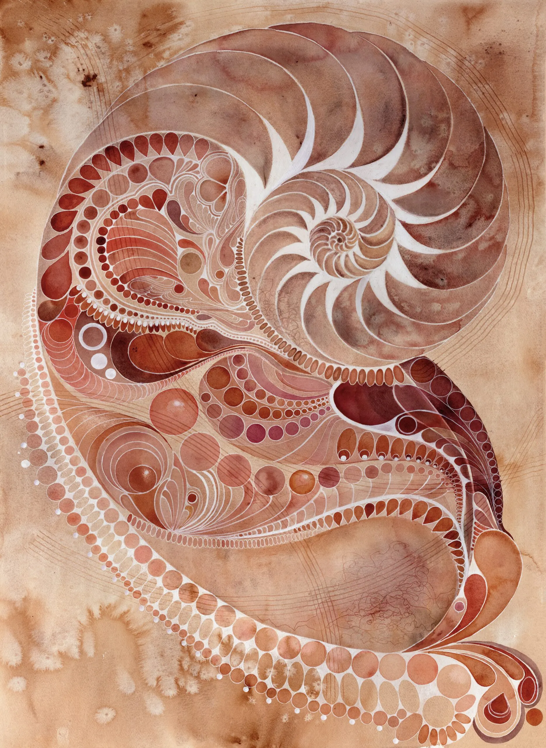 Love Urchin is where love meets infinity and creation endlessly cascades. Painted with natural extracts of Yavapai stone, red fuchsite, jasper, and garnet, this work is born directly from the earth’s minerals—its colors and frequencies infused with the wisdom of nature itself. The spiraling forms echo seashells, seed patterns, and the geometry of life, carrying the rhythm of abundance and renewal.